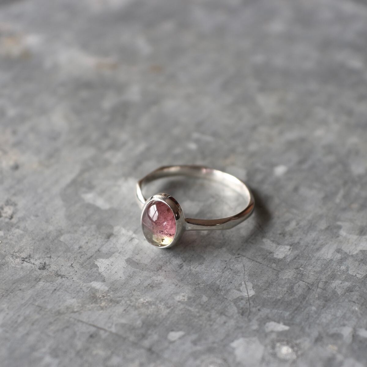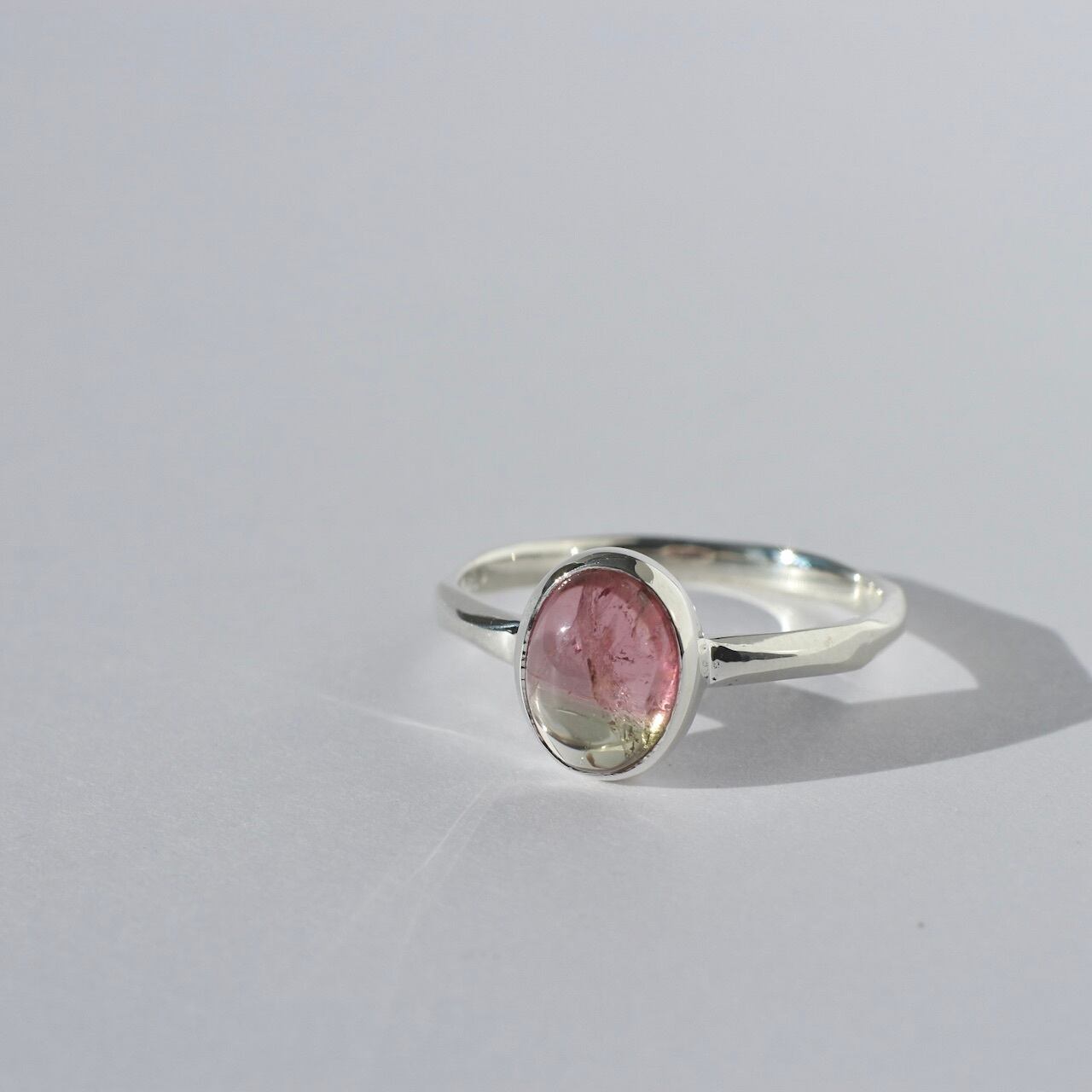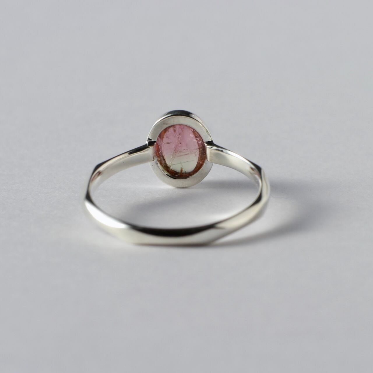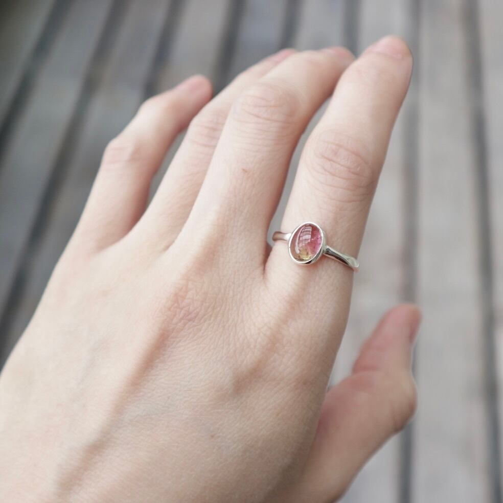 桜餅のような淡いピンクとグリーンのバイカラーが可愛いトルマリンです。リングはただの平線や甲丸ではなく、所々にクビレをつけたデザインとなっております。