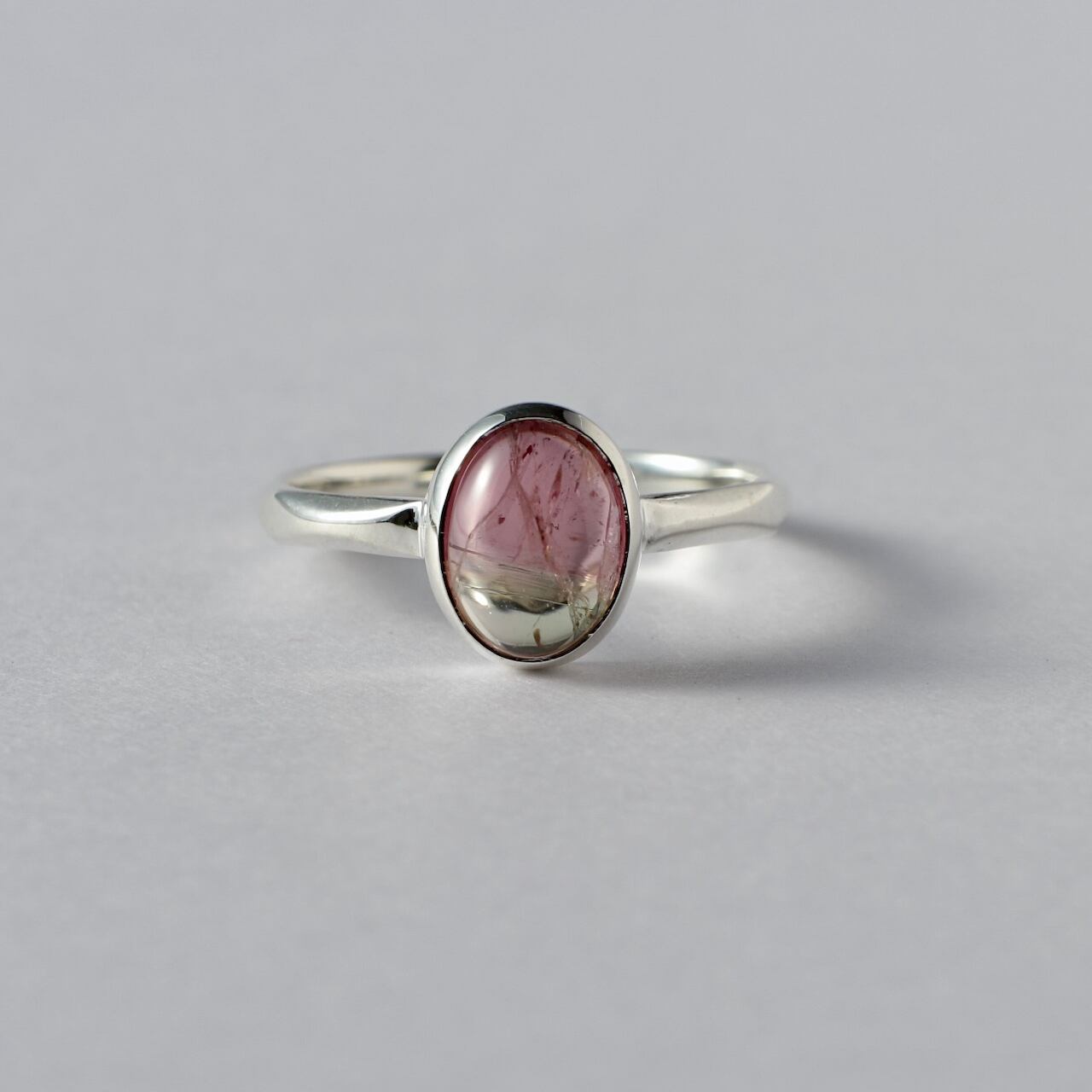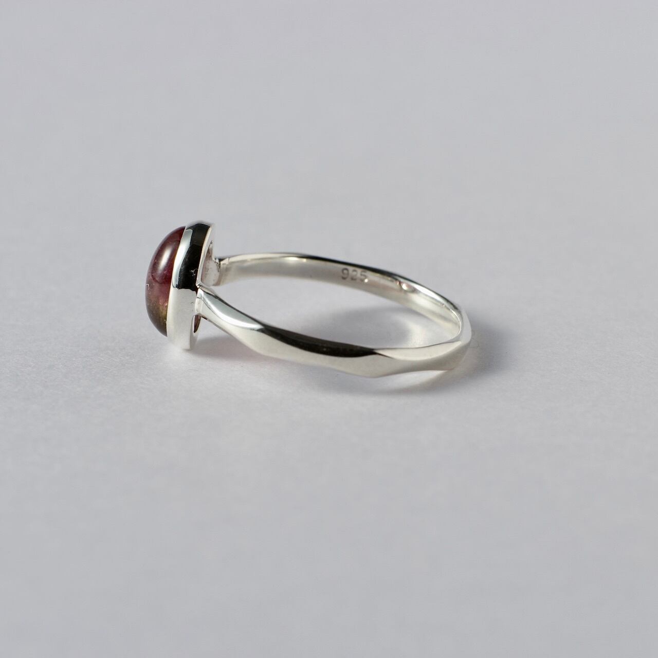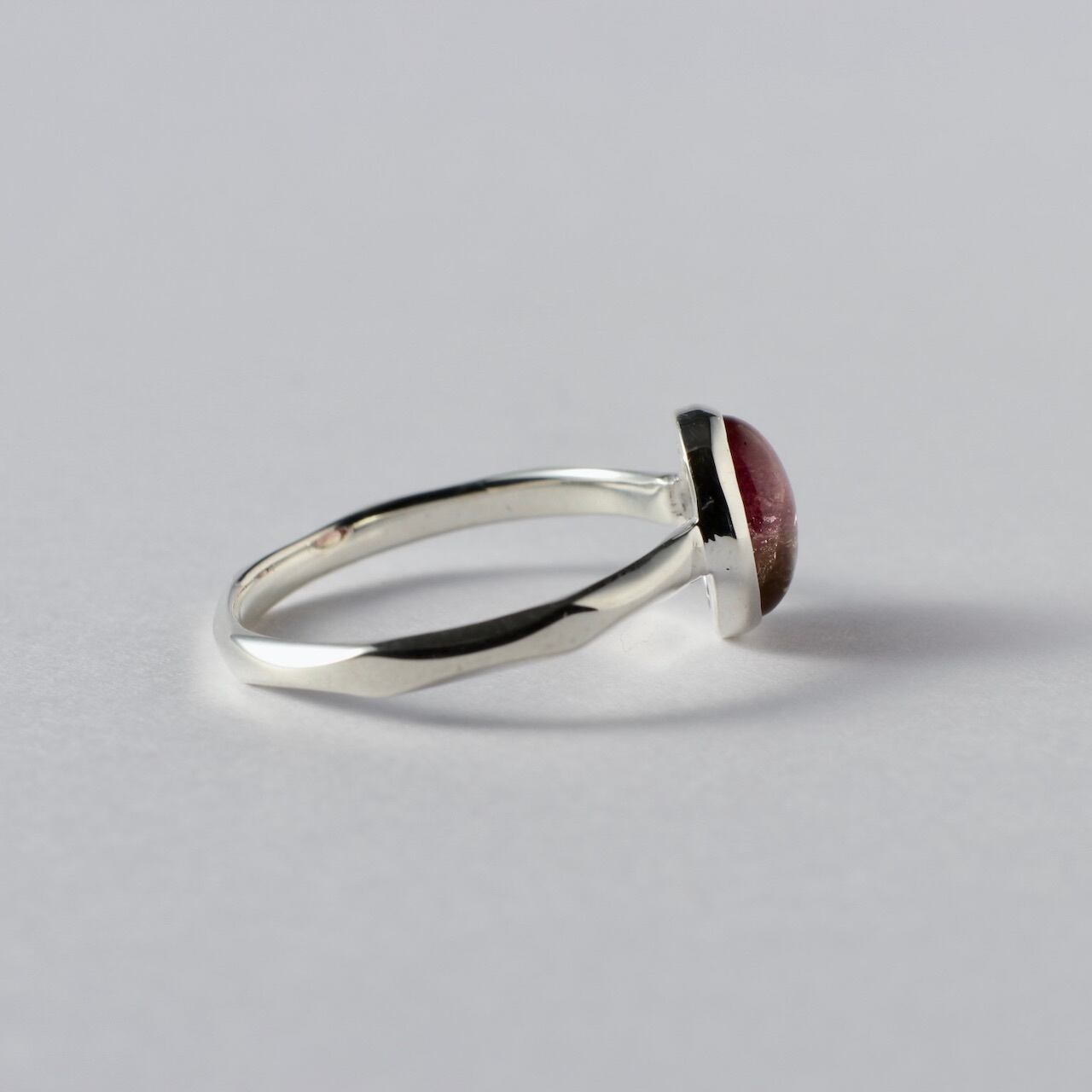 桜餅のような淡いピンクとグリーンのバイカラーが可愛いトルマリンです。リングはただの平線や甲丸ではなく、所々にクビレをつけたデザインとなっております。