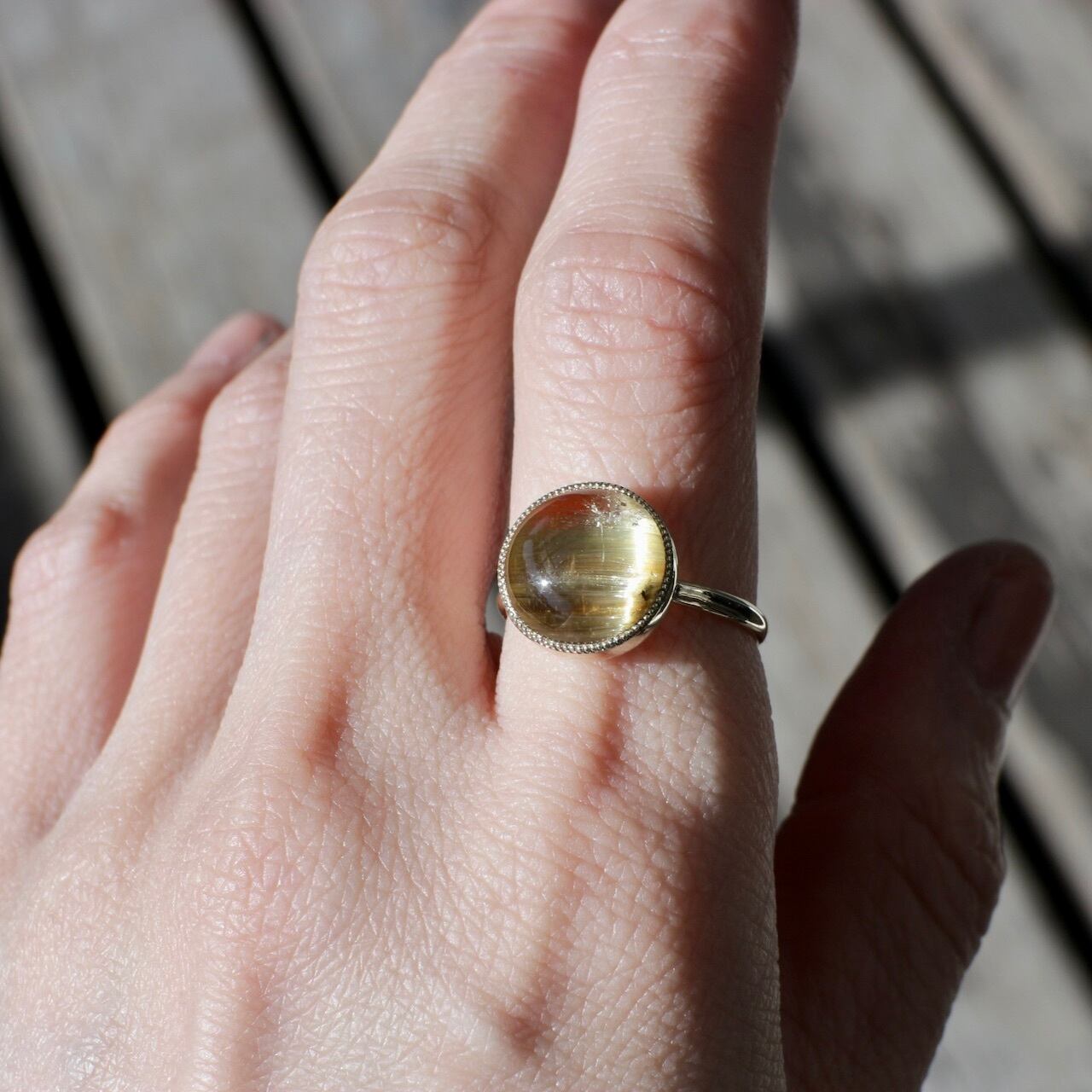 極細のルチルの針が帯のようにたっぷり入っており、光の具合でキャッツアイのように輝きます。