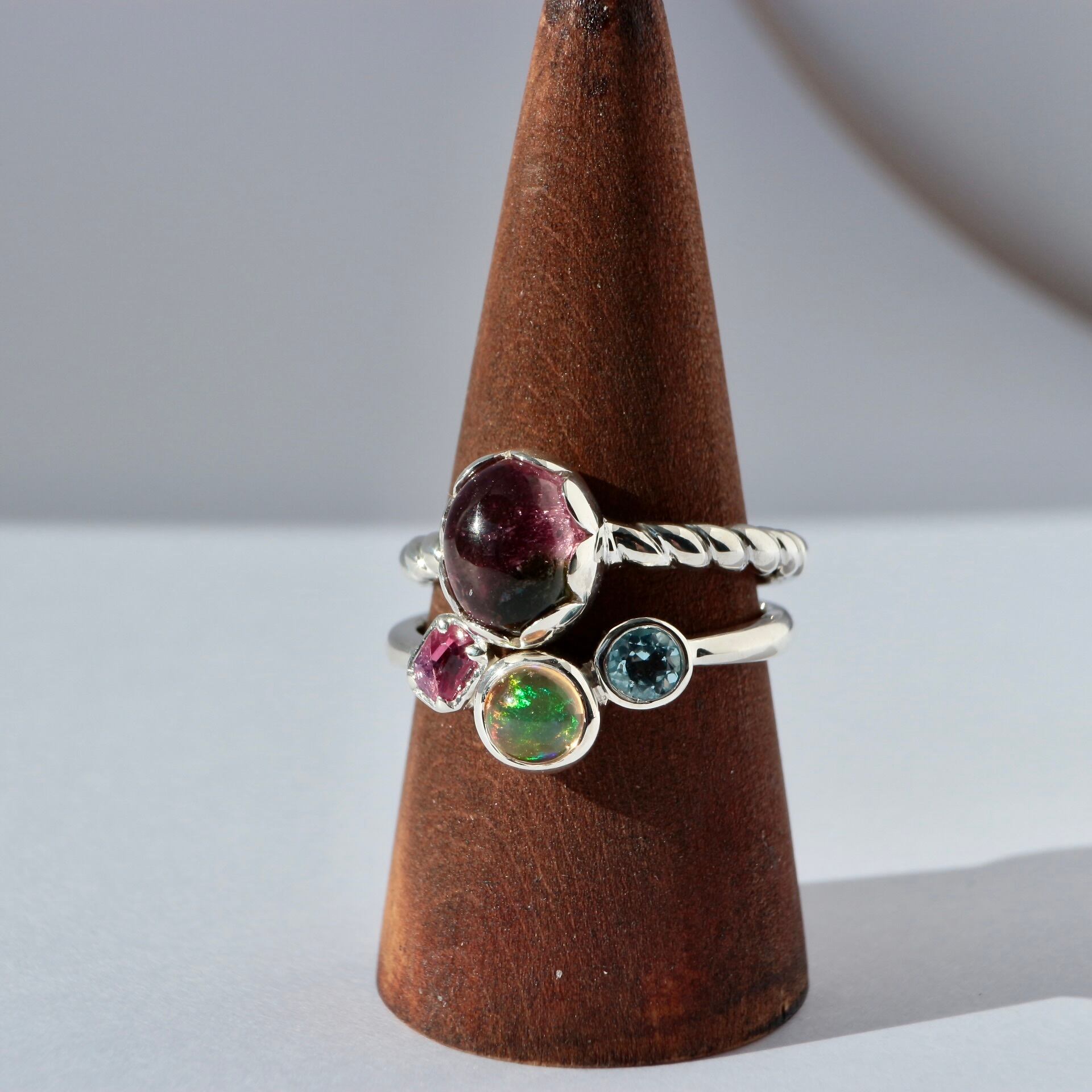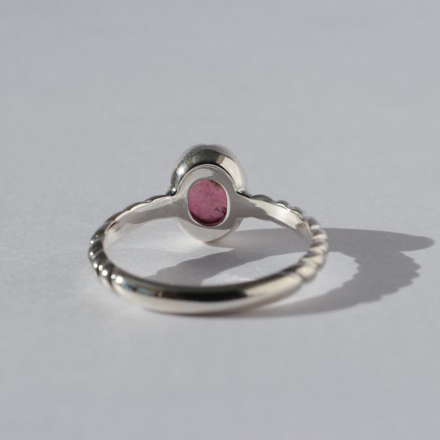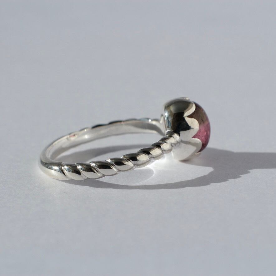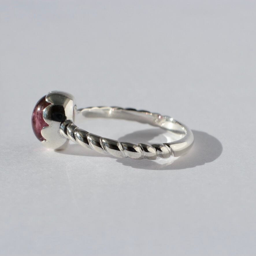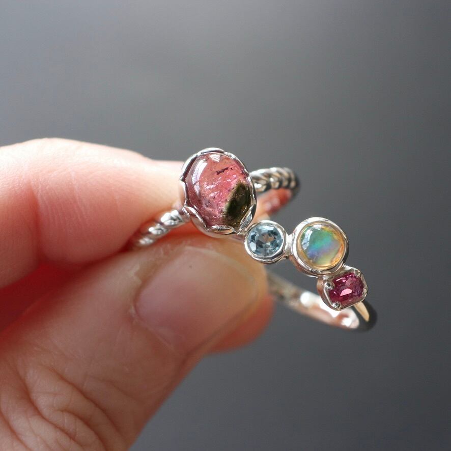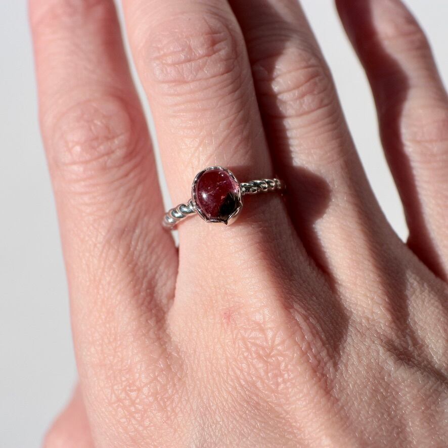 苺のようなカラーリングのトルマリンを花びらのような石座で包み、腕部分は縄目のデザインにしてみました。