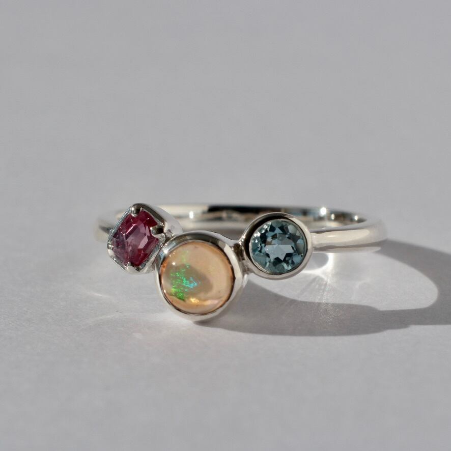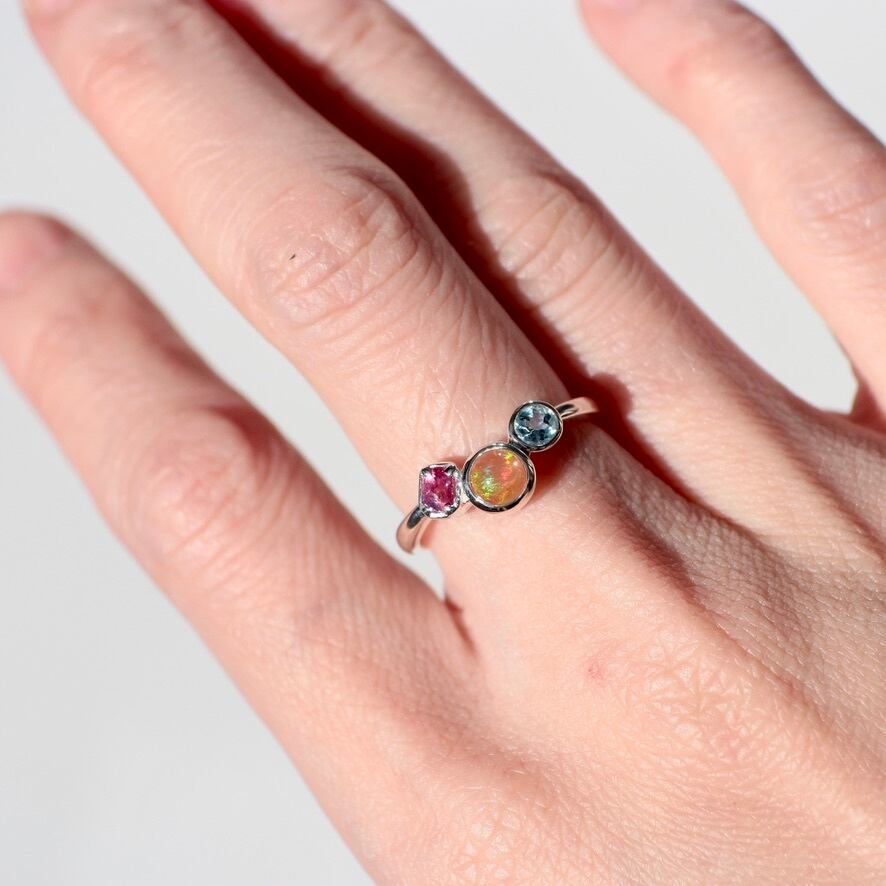 メキシコオパール・アクアマリン・ピンクサファイアの3石リングです。